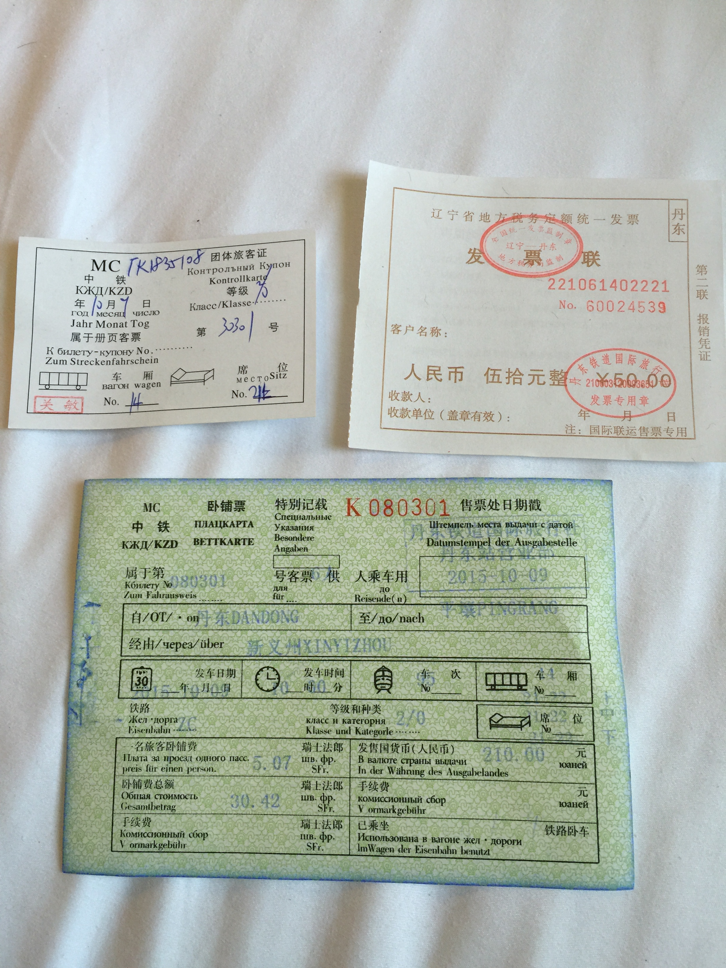 中国からの出入国のため、日本から中国往復の飛行機代は実費だ。私は大韓航空にて大連IN、北京OUTで35500円(燃油など込)、大連から丹東までのバスは99元(2000円弱)で宮崎様が手数料なしで手配してくれた。丹東まで直接、飛行機でとなると中国国際航空が最安。それらの飛行機代含めても中国の旅行会社に依頼した方が安い。私が頼んだ金橋旅行社は大連にあり、大連にも行きたかったので北朝鮮のビザは直接、宮崎様からいただいた。お会いしてごちそうしていただけただけではなく北朝鮮のいろいろな情報をいただいたり旅順に行くバスまで見送ってくれたり、大変親切にしていただいた。大連に寄らない場合はたぶん丹東で鉄道の切符とともに受け取りはなず。鉄道の切符は出発前日の17時以降に丹東駅すぐ横の丹鉄ホテルの受付にて受け取り。