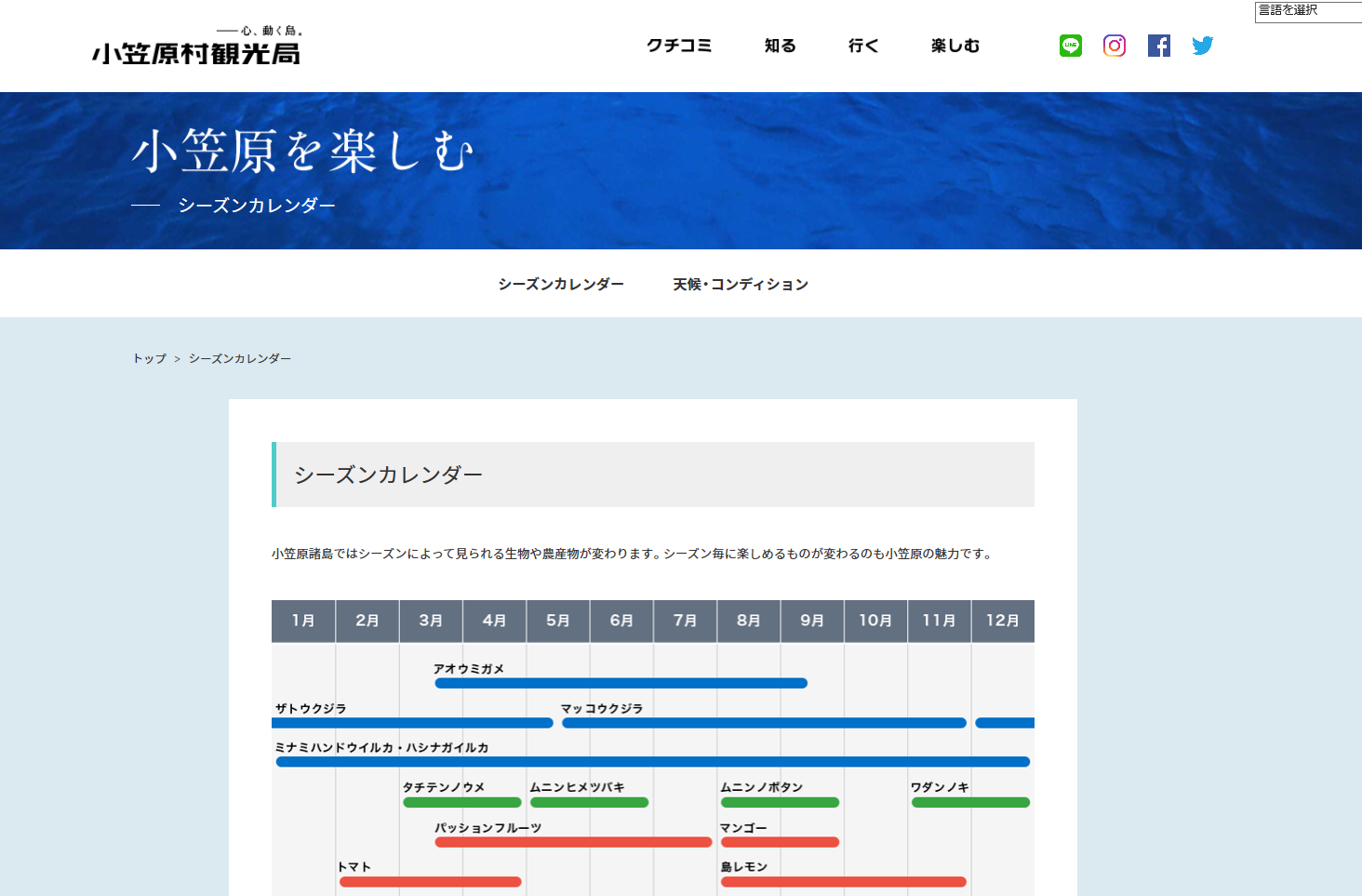 小笠原村観光局のサイトでお目当ての海の生物、フルーツなどのシーズンを確認できる。