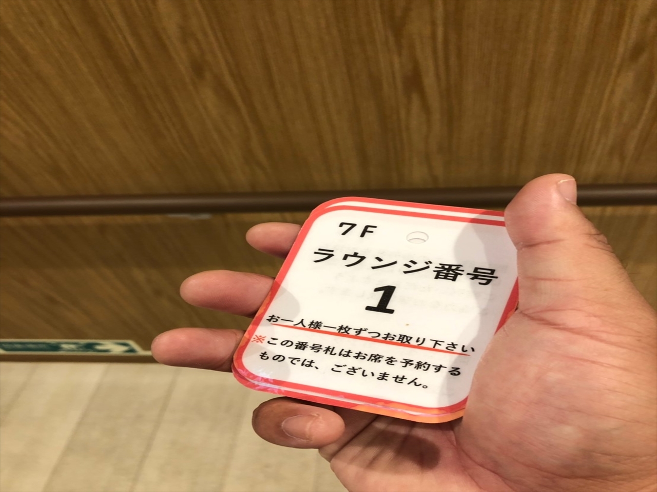 乗船開始、6デッキ、7デッキなどの上の等級の乗客が優先。前情報で7デッキの展望ラウンジHahajimaの番号札を取ったほうが良いとのことで、乗船してすぐに荷物は入口で友人に見ておいてもらい、真っ先に7階へあがって番号札をGET!