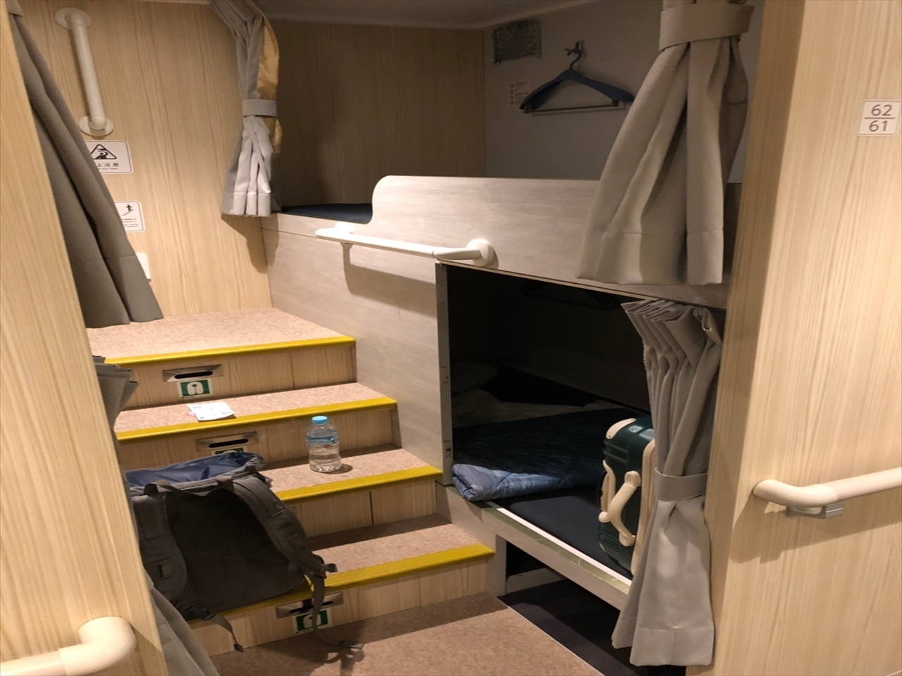 そのあと、入口に戻って自分の荷物を置きに。往路は2等寝台、最安の2等和室より3000円ほど高いがこのようにカーテン付きの半個室なのでこちらのほうがお勧め。