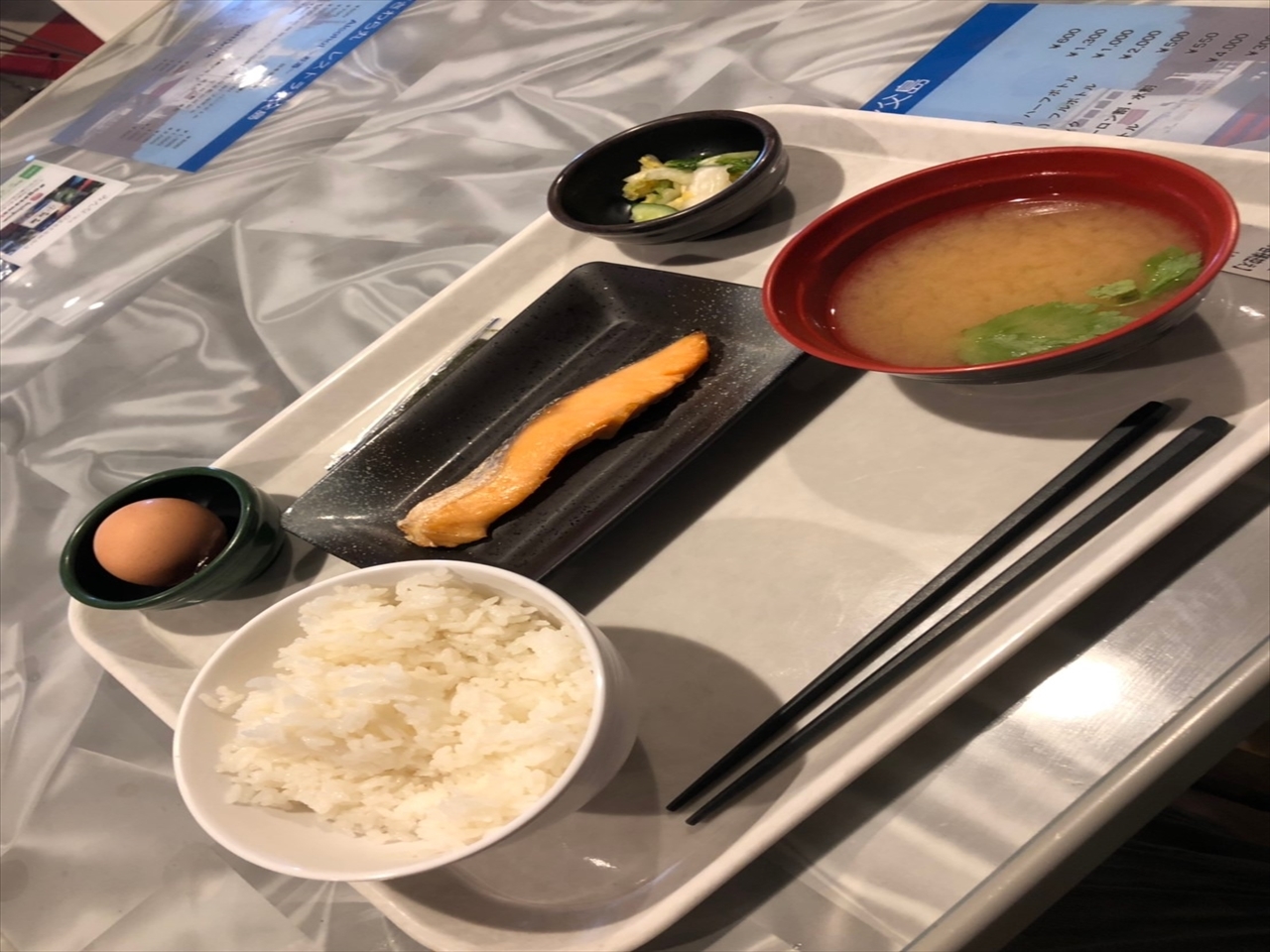 船の中の朝飯。和食か洋食を選べる。他にもアラカルトで納豆などを個別に売っている。