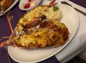 今夜は宿でディナー!大きな海老と副菜、ビールつけて20ポンドはコスパ良い!