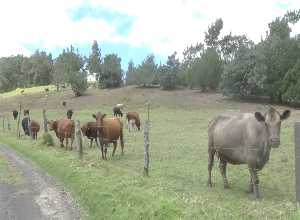 森を抜けると牧場ー!!みんなこっちを見ている。肉は輸入品と聞いていたが牛肉は島のものがあることが判明。