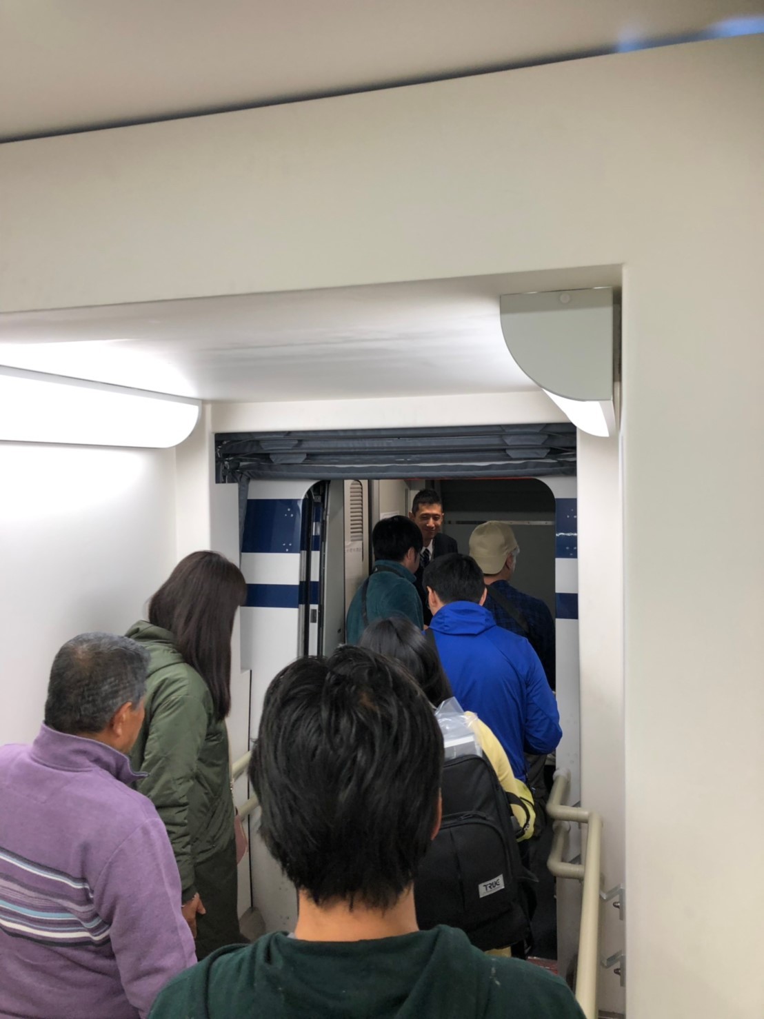 体験乗車の1時間半ほど前に着いて、いろいろ見てちょうど良かった。見学センターから200メートルほど歩いた体験乗車の建物へ移動。入口で届いたハガキのチェック。身分証明書を・・・ということであったが結果、確認されず。記念撮影、搭乗券を発券、空港張りのセキュリティチェックをしてから会議室みたいなところへ通される。搭乗券に印字された号車、席の場所へ着席。記念品が渡される。